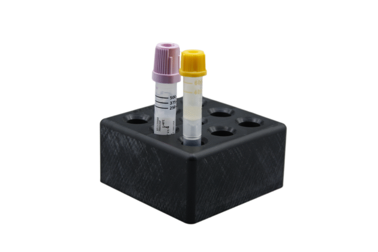 Hållare för provrör, med plats för upp till 9st rör och dränering på undersidan. Tillverkad i POM-plast.